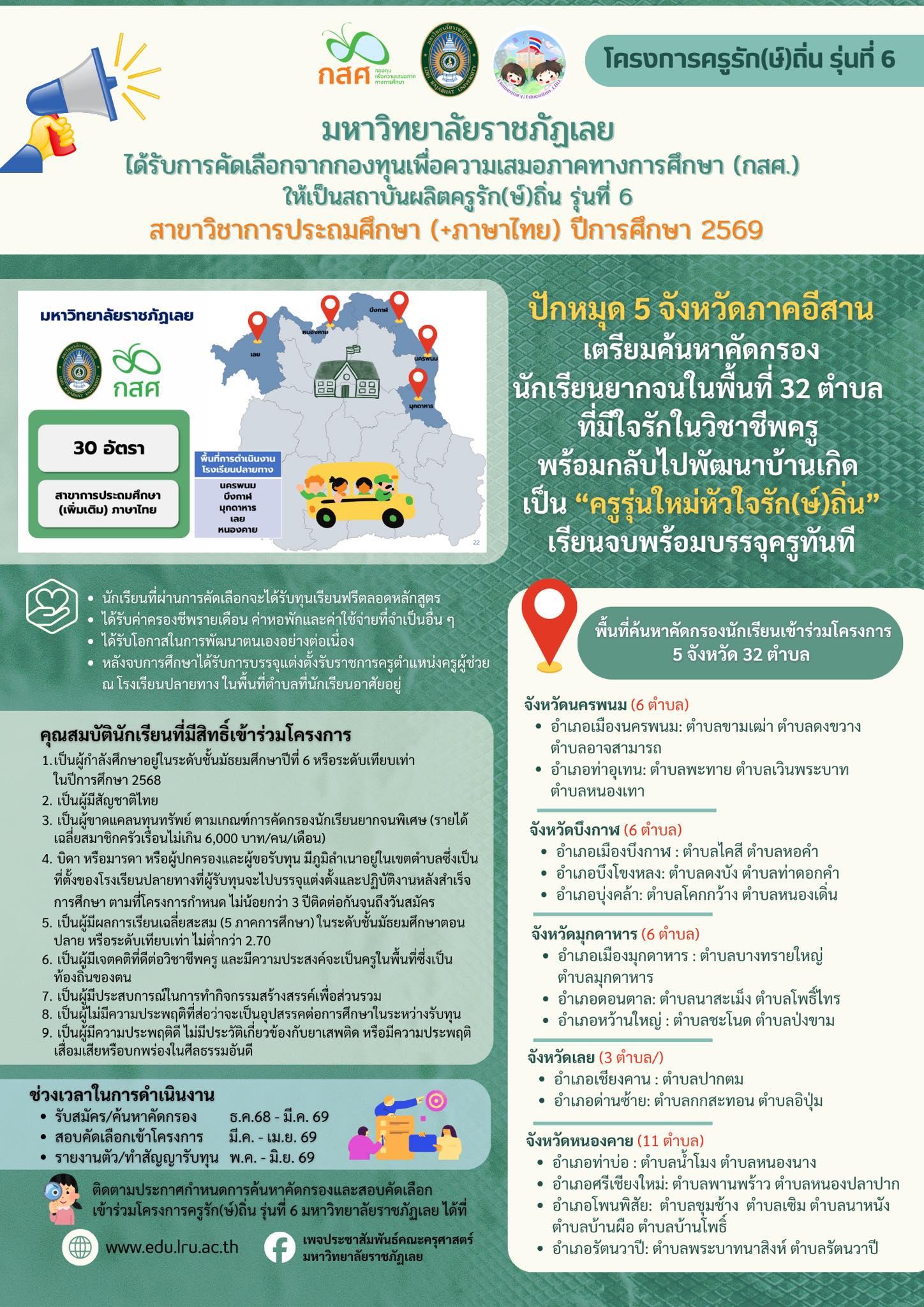 ติดตามรายละเอียดการรับสมัครเข้าโครงการได้ที่ www.edu.lru.ac.th